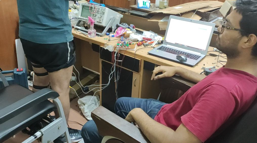 - Conduct Experiments to generate quantitative data to validate assistance provided by chair. Me and my colleague have developed an experimental setup consisting of EMG(Electromyography), force plate and motion capture system to quantify reduction in thigh muscle activation(contraction) and knee torque from experiments.